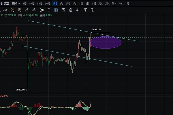 4小时级别更有意思,昨天那个W底形态简直完美。我敢打赌,很多技术派看到这个形态都兴奋地搓手。现在行情突破了2077的颈线位,接下来要是能站稳2075-2080这个区域,冲击2125就不是梦!